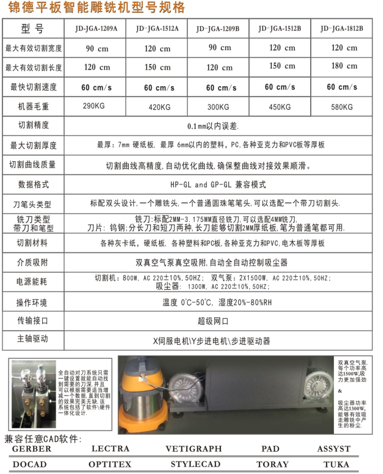 ◆全自動對刀系統(tǒng),祝您輕松換刀,自動調(diào)整和找到最佳刀壓數(shù)據(jù),快速而方便。 ◆ 配備有消音器的雙真空泵,能強力吸緊需要切割的亞克力等材料,并且控制其自動啟停,切割過程相對其他機器安靜。 ◆電腦全自動控制的吸塵器能夠當(dāng)機器運轉(zhuǎn)時自動清理產(chǎn)生的粉塵。 ◆網(wǎng)口超級智能控制器支持長距離數(shù)據(jù)傳輸和網(wǎng)絡(luò)化噴繪切割,配備伺服馬達(dá)和驅(qū)