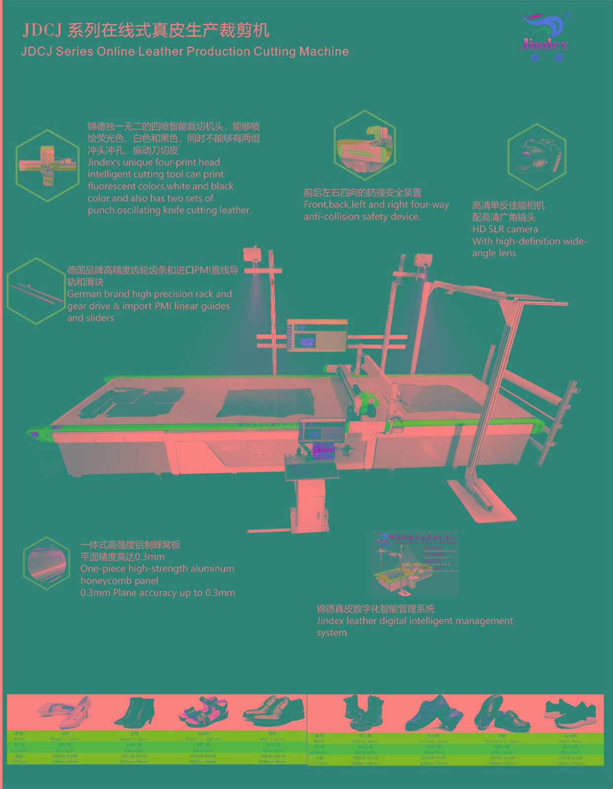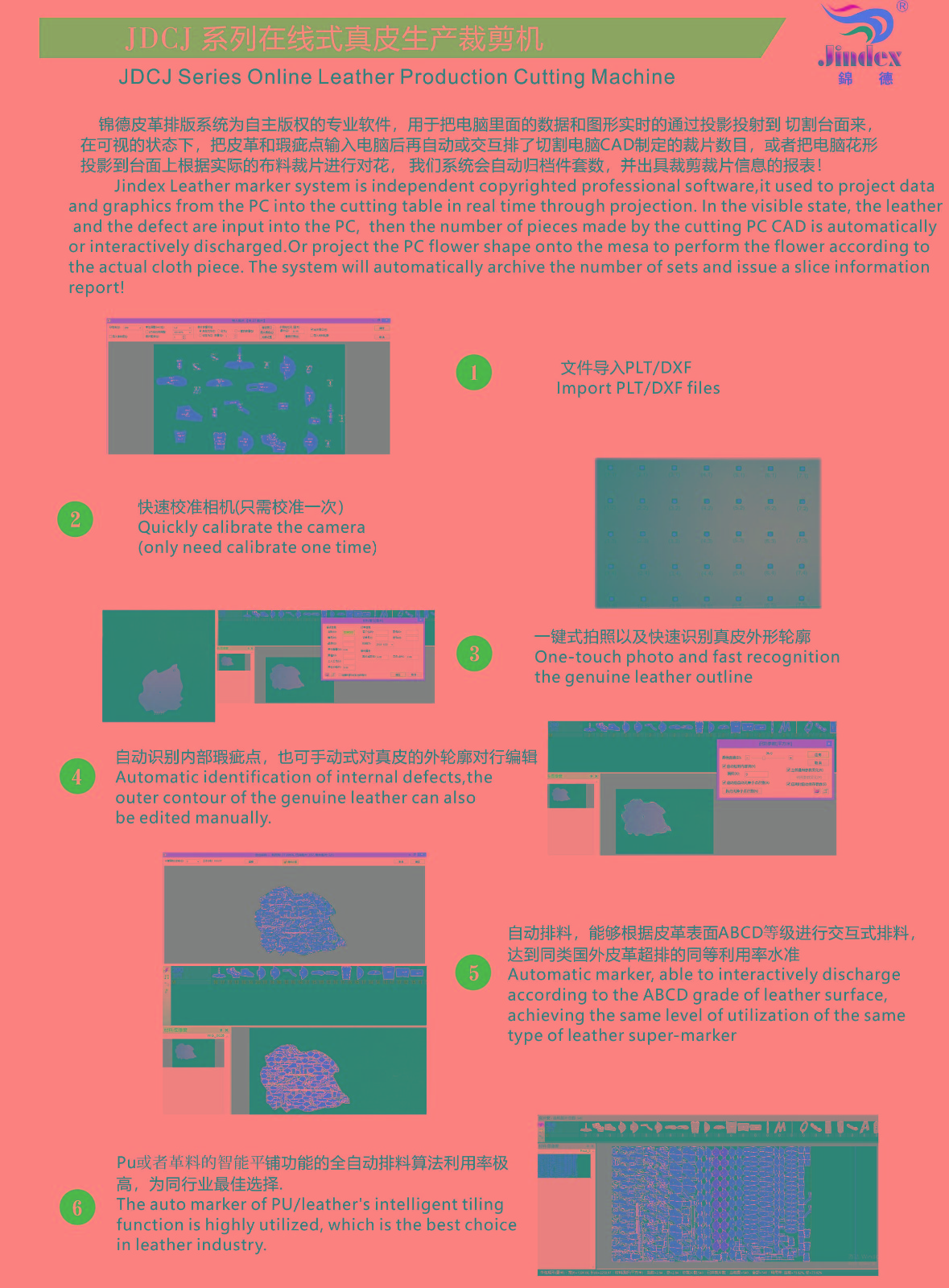 錦德全自動(dòng)真皮裁剪流水線系統(tǒng)采用最先進(jìn)的高清全彩真皮輪廓采集系統(tǒng),通過(guò)高精度掃描提取真皮不規(guī)則輪廓形狀、面積、瑕疵等信息,配合全自動(dòng)排料系統(tǒng),產(chǎn)生最優(yōu)化的裁剪方案,獨(dú)特的三段式流水工作平臺(tái),可以發(fā)揮最大裁剪效能,減少勞動(dòng)強(qiáng)度,提升綜合使用能效,裁剪效能較傳統(tǒng)真皮裁剪設(shè)備提升120%以上。